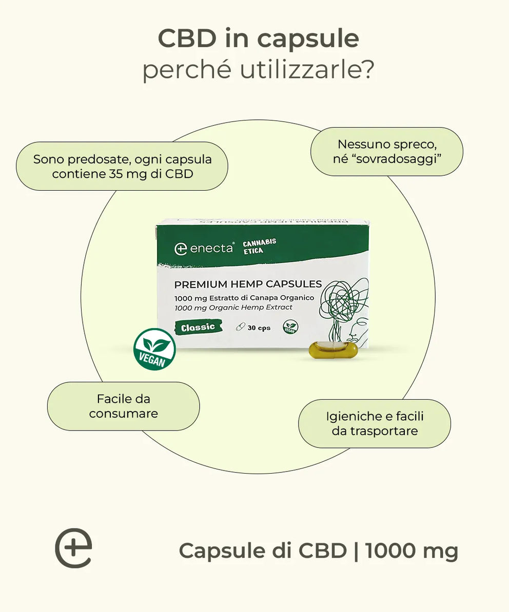 Le capsule Enecta sono la scelta ideale se stai cercando un sicuro, efficace, e CBD pratico prodotto da portare con te e utilizzare liberamente, in qualsiasi momento della giornata. L'olio di CBD contenuto nelle capsule è infatti protetto da una membrana morbida che evita la fuoriuscita del liquido, evitando così sprechi inutili del prodotto, offrendo al contempo la comodità di una capsula facilmente trasportabile, senza ingombri.
