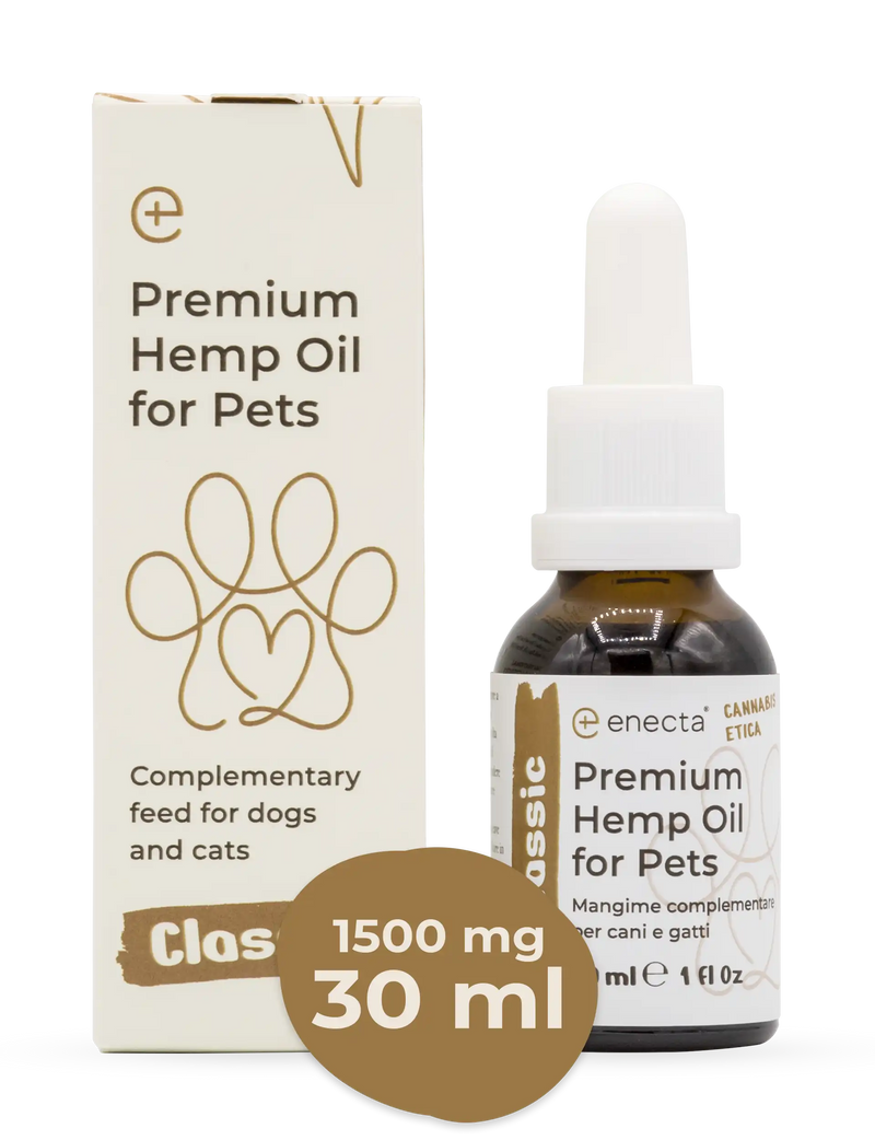 The Premium Hemp oil for pets Enecta, is produced from a type of Cannabis Sativa L. plant, rich in Phytocannabinoids, and with a THC percentage close to zero (equal or less than 0.2%, as per CE legislation n. 1782/2003) It’s a certificated Cannabis type and it’s cultivated in Italy on selected fields, chosen as per Guidelines on Good Agricultural and Collection Practice (GACP), without pesticides or herbicides, maintaining the highest standards of safety and quality.